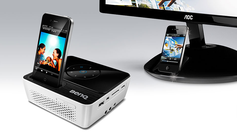 Epson machte den Anfang und hat seinen Apple-freundlichen Heimkino-Beamer MG-850HD schon seit geraumer Zeit im Handel. Nun folgt Benq mit dem Mini-Projektor Joybee GP2. Der 560 Gramm leichte Lichtwerfer mit LED-Technik (Bild oben) besitzt neben HDMI-Eingang, USB-Anschluss und Kartenleser ein Dock für iPhone und iPod. Er lässt sich wahlweise am Stromnetz betreiben oder mit einem ansteckbaren Akku, der laut Hersteller drei Stunden durchhält. Allerdings muss dafür die Lichtleistung auf bescheidene 100 ANSI-Lumen reduziert werden. Die maximale Leuchtkraft gibt Benq mit 200 ANSI-Lumen an. In dieser Betriebsart sollen sich die 1280 x 800 Pixel auf Bilddiagonalen von bis zu vier Metern verteilen lassen. Besonders hell darf es im Zimmer dann trotzdem nicht sein. Wer’s ausprobieren will: Der Joybee GP2 ist ab sofort für rund 600 Euro erhältlich