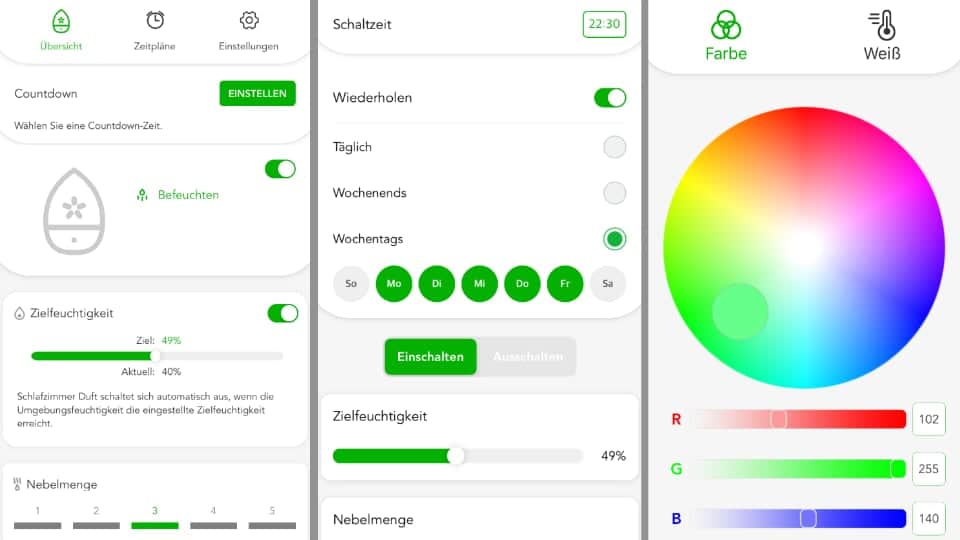 In einer HomeKit-App erscheint die Lampe dagegen zusätzlich als Luftbefeuchter – mit der Option, das Gerät nicht nur automatisch zu schalten, sondern auch zu deaktivieren, wenn eine bestimmte Luftfeuchtigkeit erreicht ist. Allerdings sollte man keine exakte Messung erwarten, da der Sensor im Gehäuse sitzt und den Nebel, den das Gerät selbst erzeugt, für Luftfeuchtigkeit hält. Er schaltet daher tendenziell eher zu früh ab. Mit einem anderen HomeKit-Sensor im Raum wie dem Eve Room lässt sich das aber leicht lösen.