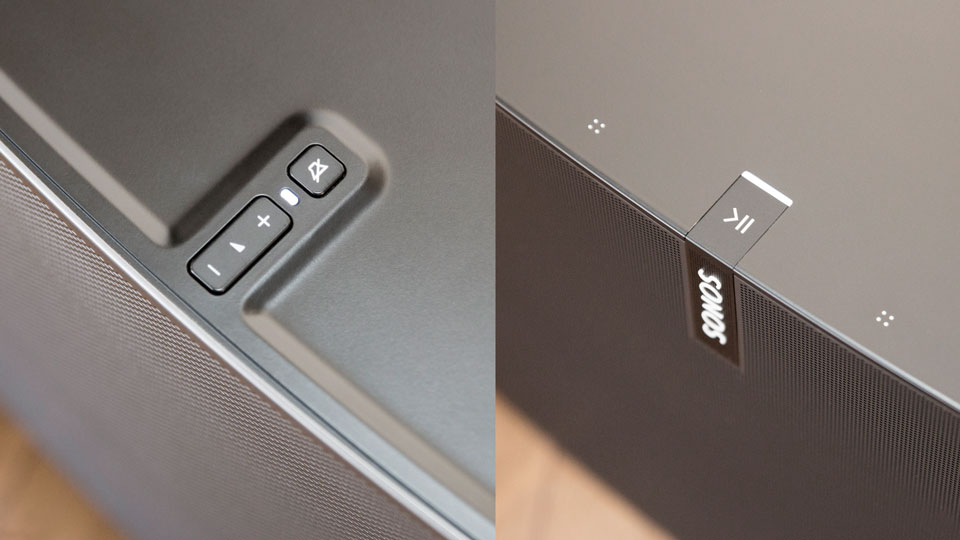 Apropos Bedientasten: Mit dem aktualisierten Play:5 hat Sonos im vergangenen Jahr ein neues Kontrollfeld eingeführt. Es arbeitet berührungsempfindlich. Die Lautstärkewippe mit „Plus“ und „Minus“ ist dabei zwei Sensorflächen rechts und links der Mute-Taste gewichen. Sie sind nicht mehr eindeutig beschriftet, was seinen Grund hat: Beim normalen Antippen steigt der Pegel (rechts) oder sinkt (links). Wer seitlich darüber wischt, springt aber zum nächsten oder vorigen Titel. Und da der neue Play:5 wahlweise liegend oder hochkant betrieben werden kann, passen Sensoren im Innern die Tastenbelegung an die Ausrichtung des Lautsprechers an: Spielt er senkrecht, ist die oben liegende Fläche für „lauter“ zuständig, die untere für „leiser“. Das heißt für langjährige Sonos-Nutzer Umlernen, ist dann aber sehr bequem, weil es das Smartphone in vielen Fällen überflüssig macht. Noch komfortabler sind nur Stationstasten am Gerät, wie sie Bose oder Raumfeld bieten.