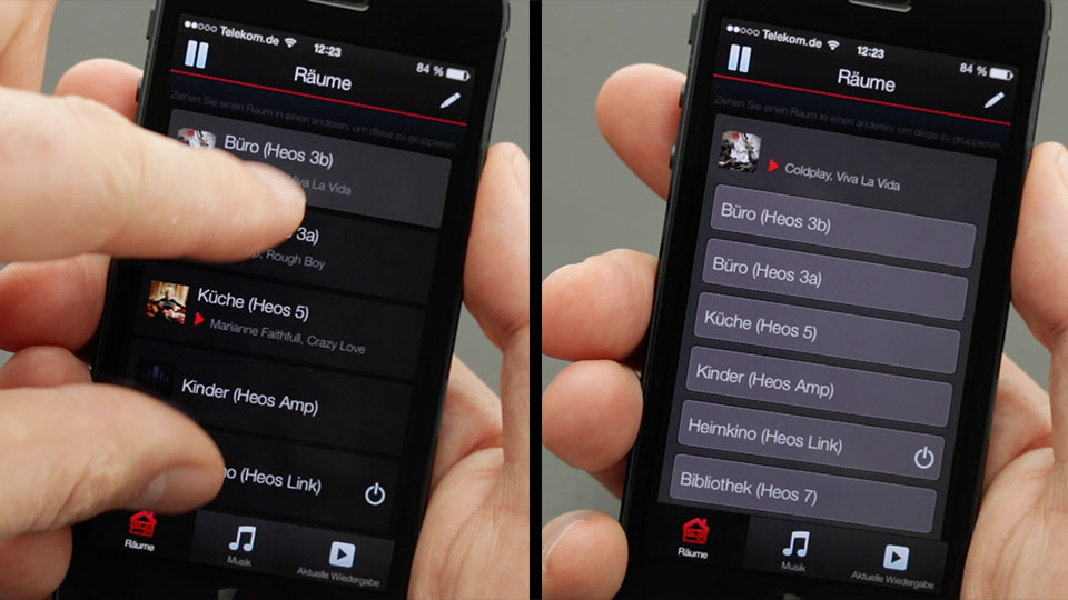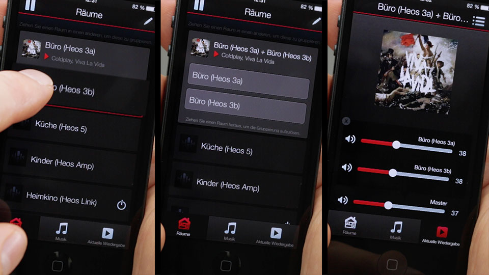Die Fernbedienungs-App kommt klar und schnörkellos daher. Das Menü besteht aus drei Reitern: Räume, Musik und Aktuelle Wiedergabe. Um einen Song zu starten, wählt man einen Raum, springt zur Musikauswahl und steuert dann im dritten Fenster den Abspielvorgang. Der Raum bleibt solange aktiviert, bis ein anderer gewählt wird und das Spiel mit diesem von vorn beginnt. Unter Räume ist dabei immer zu sehen, wo welches Programm läuft. Das mag banal klingen, ist aber keine Selbstverständlichkeit. Die Multiroom-Systeme Pure Jongo und Peaq Munet können zum Beispiel keine unterschiedlichen Streams in die einzelnen Räume schicken. Schiebt man zwei oder mehr Heos-Player in der App mit Daumen und Zeigefinger zusammen, verschmelzen sie zu einer Hörzone. „Pinch to Party“ nennt Denon diese Fingergeste, die jedem Smartphone-Besitzer vom Zoomen am Touchscreen geläufig sein dürfte.