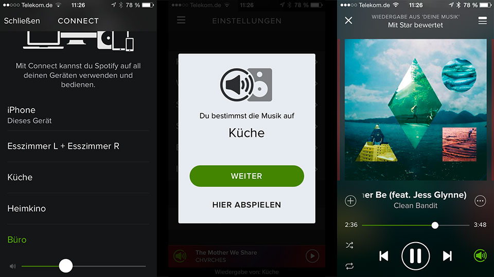 Neben Songs und Alben aus dem heimischen Netzwerk spielt Heos natürlich auch Programm aus dem Internet ab. Zum obligatorischen Webradio, das wie häufig von TuneIn verwaltet wird, kommen aktuell die Abodienste Deezer, Napster und Spotify. Während die ersten beiden in der Heos-App gesteuert werden, wechselt zur Spotify-Wiedergabe das Programm. Der Streaming-Anbieter will das so und reißt mit Spotify Connect die Kontrolle an sich: Die Auswahl von Titel und Lautsprecher finden in der App des Musikdienstes statt. Zuvor gruppierte Lautsprecher tauchen dort als Gruppe auf, wer umgruppieren oder den Party-Betrieb aktivieren will, muss zurück in die Heos-App. Das mag anfangs gewöhnungsbedürftig sein, hat aber auch Vorteile. So lassen sich Spotify-Lautsprecher verschiedener Hersteller aus einer App heraus bedienen und statt dem Heos-System zum Beispiel auch ein Amazon Fire TV oder Smart-TV von Philips mit Musik versorgen.