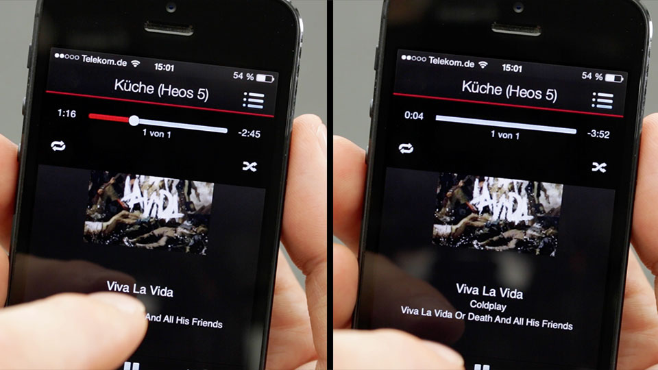 Allerdings verhält sich das Programm beim Auseinanderziehen der Räume nicht ganz wie erwartet. Im Test änderte sich manchmal die Reihenfolge der Player auf dem Schirm. Zwei Heos 3, die ich vor dem Party-Betrieb zu einem Stereopaar verkuppelt hatte, spielten danach wieder als Solisten. Das ist nicht weiter tragisch, aber bei Sonos läuft die Umgruppierung etwas geschmeidiger und zuverlässiger ab. Und in noch einem Punkt hat der Multiroom-Pionier aus Kalifornien die Nase vorn: Weil Sonos mit Netzwerk-Freigaben arbeitet und aus den Ordnern vom NAS-System oder Computer einen eigenen Musikkatalog erstellt, kann das System in allen Tracks problemlos navigieren. Es kennt von jedem Stück die Spieldauer und folgt dem Finger beim Scrubbing am Bildschirm an die gewünschte Stelle. Wer Hörbücher mit umfangreichen Kapiteln wiedergibt, weiß diese Funktion zu schätzen – und muss nach einer Lesepause den langen Track nicht wieder ganz von vorne hören.