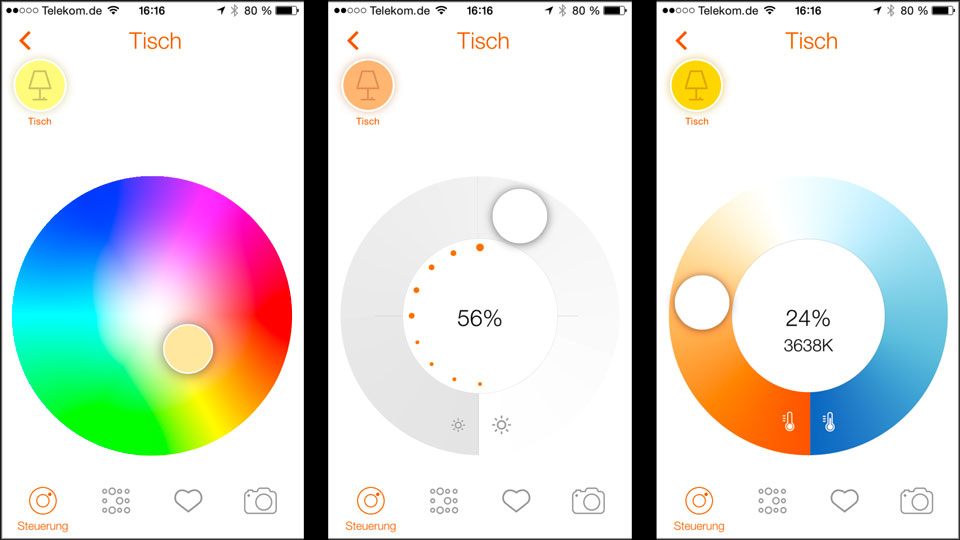 Was nicht heißen soll, dass die Lightify-App schlecht gestaltet wäre. Die Einstellseiten für Farbe und Intensität gefallen mir sogar richtig gut. Auf ihren großen, kreisförmigen Reglern sind die Töne leichter zu treffen als mit den etwas fummeligen Bildschirmmarkern von Philips. Einmal ermittelte Farbtemperaturen findet man schnell wieder, weil die App einen Prozentwert angibt. Im Farbspektrum der Philips-App schieße ich dagegen gerne übers Ziel hinaus – vor allem auf kleinen Smartphone-Displays, wo jeder Zentimeter schon deutliche Veränderungen bewirkt.