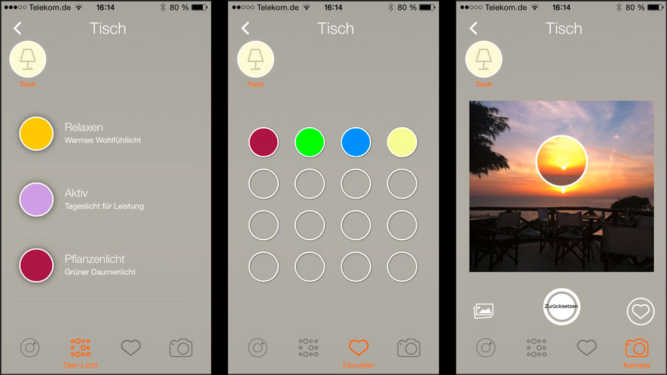 Unter „Favoriten“ erscheinen Farb-/Helligkeitswerte, die an verschiedenen Stellen im Programm mit einem Druck auf das Herzsymbol markiert wurden – eine Funktion, die Philips Hue nicht bietet. Dort lassen sich keine Lieblingsfarben in eine neue Szene übernehmen. Man beginnt stattdessen immer mit vorhandenen Einstellungen, ändert sie nach seinen Wünschen ab und speichert sie unter neuem Namen. Die Seite „Kamera“ schließlich ähnelt dem Hue-Pendant: Fotos von der Smartphone-Kamera oder aus dem Telefonspeicher dienen als Vorlage für eigene Lichtkompositionen.