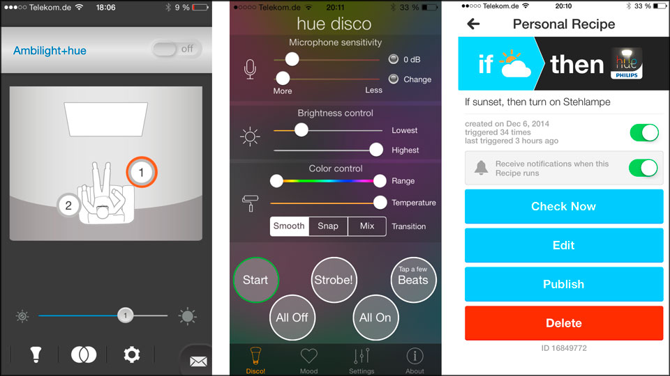Während Osram noch an einer Entwicklerschnittstelle arbeitet, hat Philips sein „Application Programming Interface“ bereits vor Jahren offen gelegt. Das macht sich nun bezahlt: Software-Entwickler in aller Welt nutzen die API, um eigene Apps zu programmieren. Es gibt Tools, die Musik übers Smartphone-Mikrofon aufnehmen und Lichter im Rhythmus dazu flackern lassen – oder welche, die Kerzen und Kaminfeuer simulieren. Die Qualität schwankt, was sich bei einer offenen Plattform wohl kaum vermeiden lässt. Ich persönlich mag „IFTTT“ („If This Than That“), um im Homeoffice das Licht aufzudrehen, sobald es dunkel wird. Dort stört es auch nicht, dass die Befehlssätze der kostenlosen Online-Plattform lediglich die Standardeinstellung Warmweiß beherrschen und keine farbigen Lichtszenen aufrufen können.