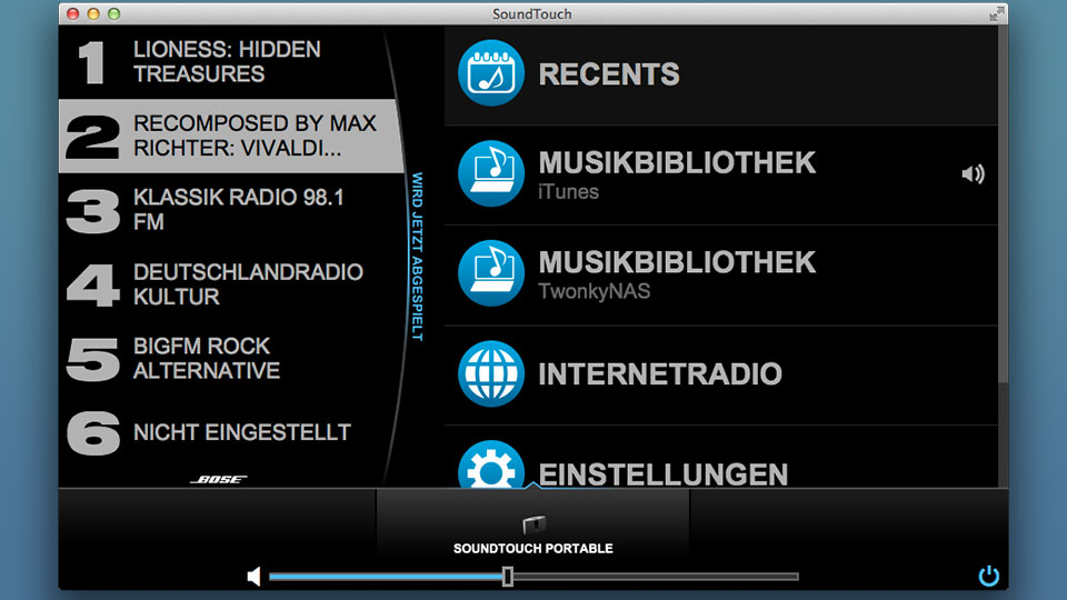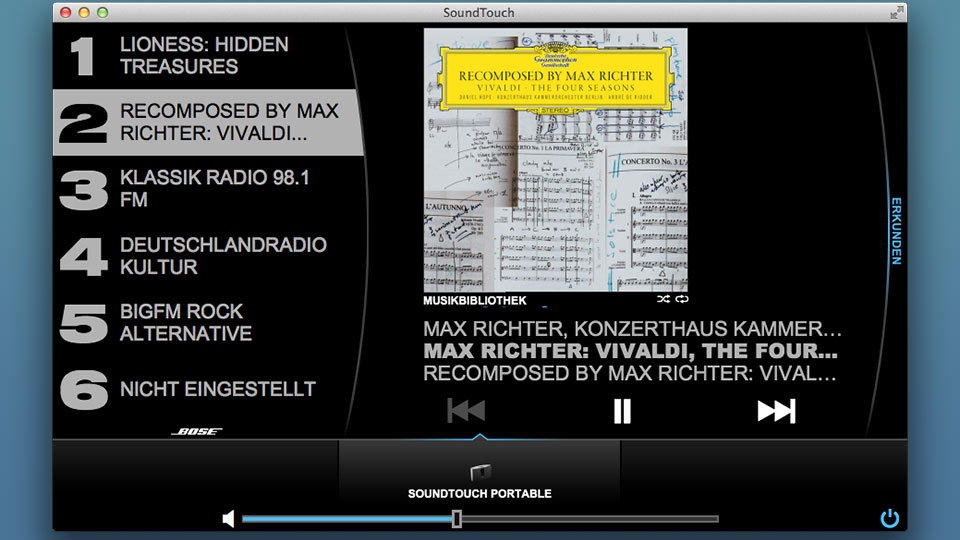 Nach der Anmeldung beim SoundTouch-Konto erscheint das großflächige Hauptmenü. Es zeigt am linken Bildschirmrand die sechs Presets, zunächst noch mit dem Hinweis „nicht eingestellt“. Mehr als die Hälfte des Displays nimmt das große Wiedergabefenster ein, in dem der aktuell laufende Titel oder der aktuelle Radiosender zu sehen sind. Sehr gut: Die Oberfläche ist auf Smartphone, Tablet und Computer weitgehend identisch, so dass man sich nicht umgewöhnen muss. Ein Tipp auf „Erkunden“ öffnet von rechts die Schublade mit den Musikquellen. Neben Internetradio und Hörverlauf („Recents“) tauchen hier iTunes- und Windows-Mediatheken sowie UPnP-Server auf, die in den Einstellungen hinzugefügt wurden. Die Auswahl einer dieser Quellen führt ins jeweilige Untermenü mit Radiosendern, Künstlern, Alben oder Titeln. Zum Durchforsten des Katalogs scrollt man einfach durch die Listen, was bei umfangreichen Musiksammlungen etwas dauert. Mit einer Suchfunktion ginge es schneller.