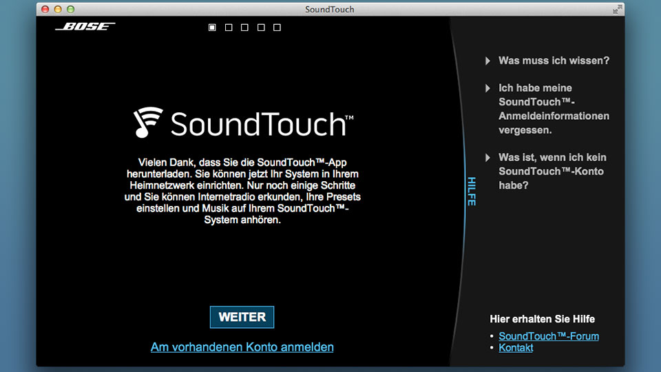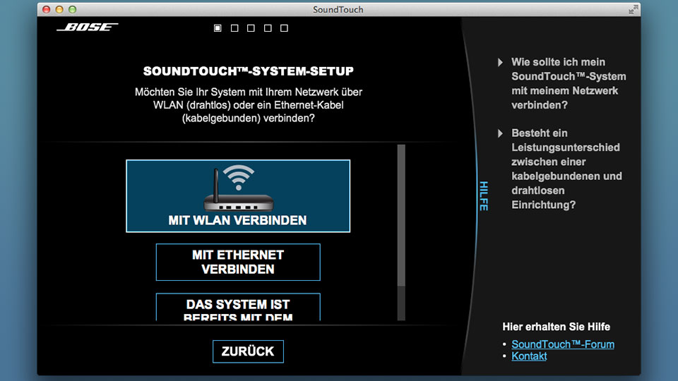 Alle drei Methoden sind verständlich erklärt und schnell erledigt. Falls der Installations-Assistent das Funknetz nicht findet, liegt es wahrscheinlich am WLAN-Standard: Die Bose-Lautsprecher empfangen ausschließlich Signale im 2,4 GHz-Band nach 802.11 b/g. Neuere Funkvarianten wie 802.11n/ac und das 5-GHz-Frequenzband werden nicht unterstützt. Wenn möglich, sollte am Router also eine zu 802.11b/g kompatible Betriebsart eingestellt sein.
