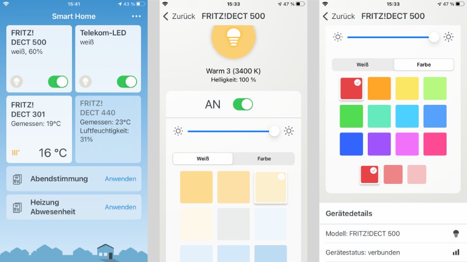 WAS GEHT? AVM und die Deutsche Telekom bieten kompatible Leuchtmittel an. Von beiden gibt es eine Lampe mit E27-Gewinde. Über andere Hersteller oder Bauformen ist noch nichts bekannt. Wer Steckdosen an der Fritzbox angeschlossen hat, kann damit aber konventionelle Tisch- und Stehleuchten schalten. Auch Timer oder Vorlagen stehen zur Verfügung. Mit LED-Lampen gibt es eine Aufwach- und Einschlaffunktion, die über 15 Minuten das Licht in der eingestellten Farbe auf- beziehungsweise abblendet.