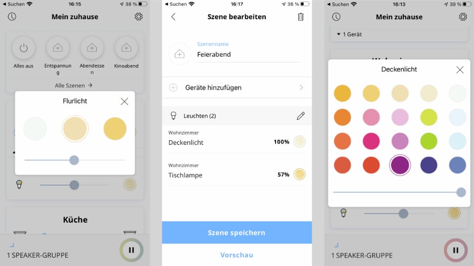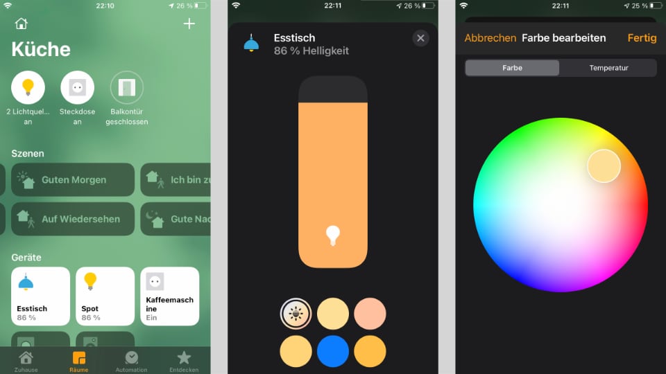 WIE GEHT’S? Die serienmäßige Home-App auf iOS-Geräten fügt neue Leuchtmittel hinzu. Der Prozess ist standardisiert und läuft immer gleich ab: HomeKit-Code von der Lampenverpackung abtippen oder mit der iPhone-Kamera abscannen, das ist schon alles. Die Home-App dient anschließend auch zur Steuerung und Automatisierung von Lampen, etwa für die An- und Abwesenheit. Wer Regeln mit mehr Auslösern und Bedingungen wünscht, kann alternative HomeKit-Apps wie das Programm von Eve dafür verwenden.